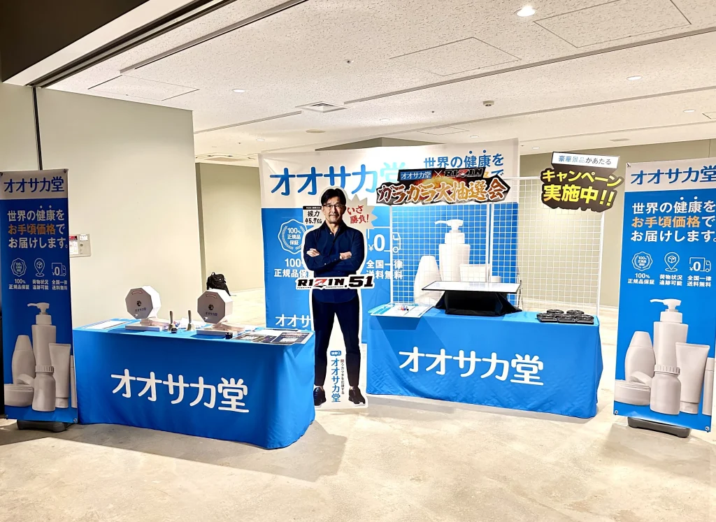 会場に設置したオオサカ堂ブースでは、RIZINの榊原CEOとの握力勝負イベントや、豪華景品が当たるガラガラ抽選会を実施。試合さながらの熱戦が繰り広げられ、終日大盛況となりました。