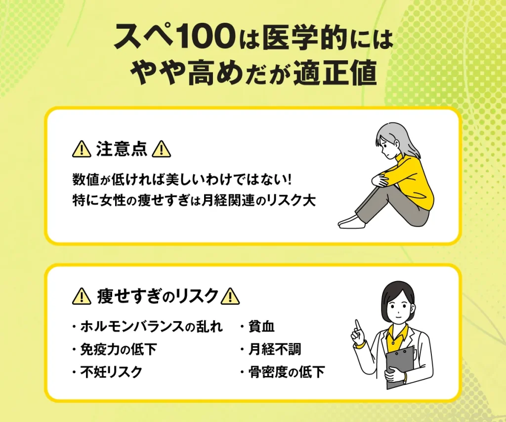スペ100については一般的には痩せすぎと見られることは少ないようですが、スペ値自体は手軽さで人気になっただけで医学的根拠には欠けると言えます。